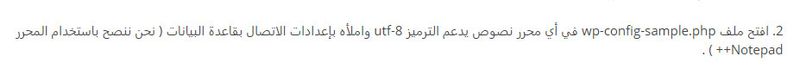 <p>2. افتح ملف wp-config-sample.php في أي محرر نصوص يدعم الترميز utf-8 واملأه بإعدادات الاتصال بقاعدة البيانات ( نحن ننصح باستخدام المحرر Notepad++ ) .</p>But the browser displays the two plus signs as if they were part of the Arabic text, because they are weak characters in a right-to-left direction document. The algorithm doesn’t know that the two numerical characters are part of the left-to-right sequence. To resolve this issue, we can use a bdo or bdi tag to override the algorithms automatic behaviour.